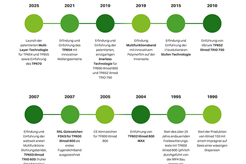 Wer mit der Zeit gehen will, muss ihr immer einen Schritt voraus sein. Nach dieser Devise entwickeln und produzieren wir seit über 70 Jahren vorkomprimierte Dichtungsbänder. So haben wir 2007 mit der Einführung des ersten Multifunktionsdichtungsbandes den Abdichtungsmarkt revolutioniert.
