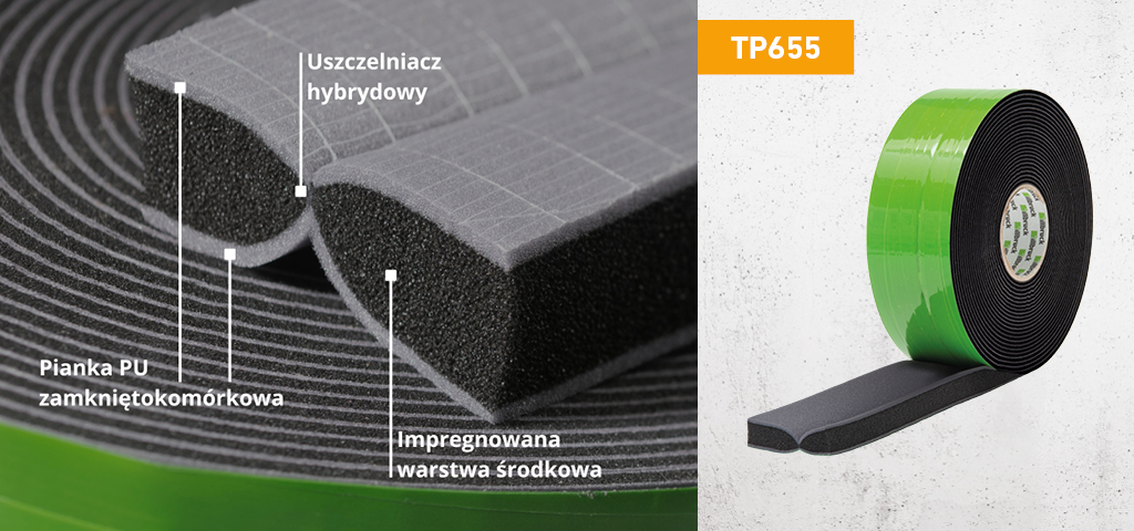 TP655 z technologią wielowarstwową jest zatem ekonomicznym rozwiązaniem do niezawodnego uszczelniania połączeń okiennych. Symetryczna struktura taśmy jest materiałowym połączeniem pianki z uszczelniaczem hybrydowym i zapewnia – dzięki prostej obróbce – niezawodne uszczelnienie złącza okiennego. Również w przypadku tej taśmy zoptymalizowane strony zewnętrzne, nawet przy nierównych krawędziach połączeń i profilowanych ramach, tworzą ciągłą, hermetyczną powierzchnię styku i zapewniają szczelność.