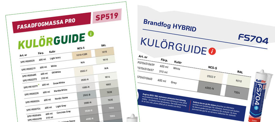 Nu lanserar vi våra uppdaterade kulörguider för illbruck SP519 Fasadfogmassa Pro och Nullfire FS704 Brandfog Hybrid– framtagna för att göra det enklare att välja rätt kulör vid fogning i fasad och interiör.